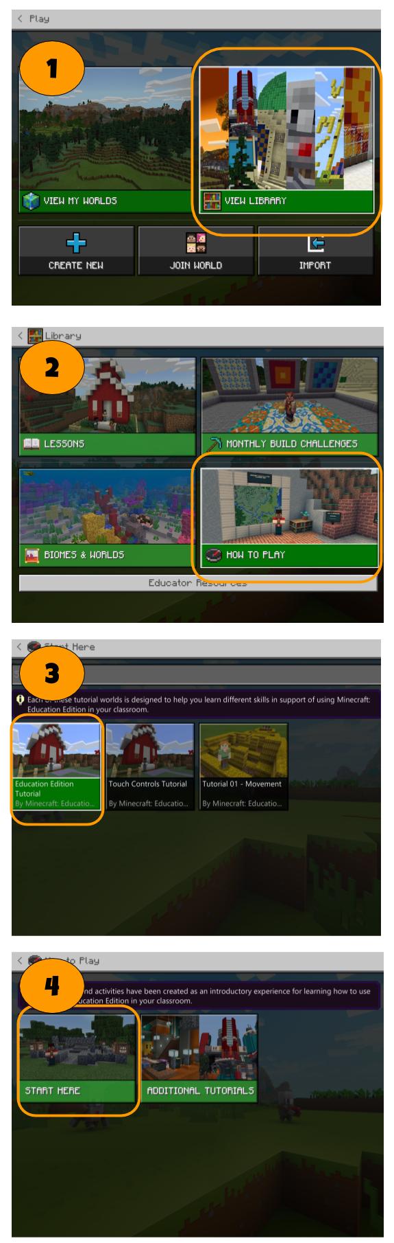 Open the Minecraft Tutorial world by following the steps in the image below. I recommend at least an hour in here to help you practice your skills before moving on. It gets progressively more difficult so this world is great to come back to you when you are ready to learn new skills.